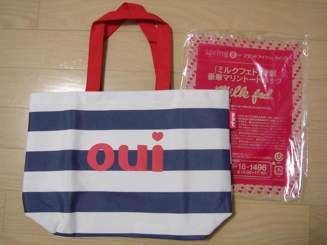 これは姉に。スプリング付録の、ミルクフェドのマリントート!姉のような小柄なおんなのこがもつとかわいいかなって。これも100えん。